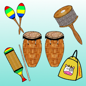 Various percussions: drum, percussion, bongo, cabasa, claves, conga, cowbell, guiro, maracas, tambourine