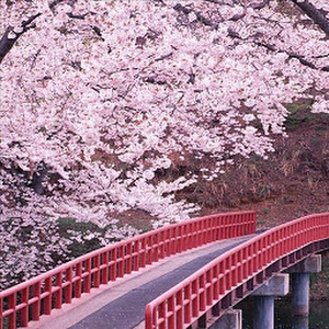 Animated wallpaper Japanese Bridge!Tags: cherry, sakura, leaves, white, bridge, tree, plants, landscape, oriental, japan, petals, flowers.